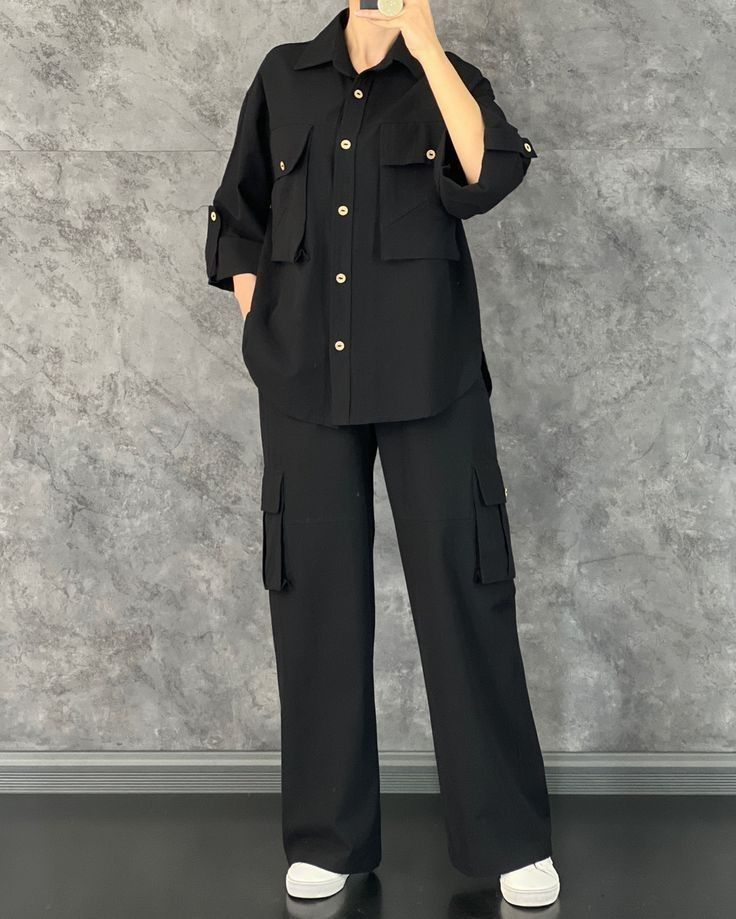 Command attention with this all-black utility co-ord set. Featuring an oversized button-down shirt with bold pockets and wide-leg cargo trousers, it balances comfort with street-style edge